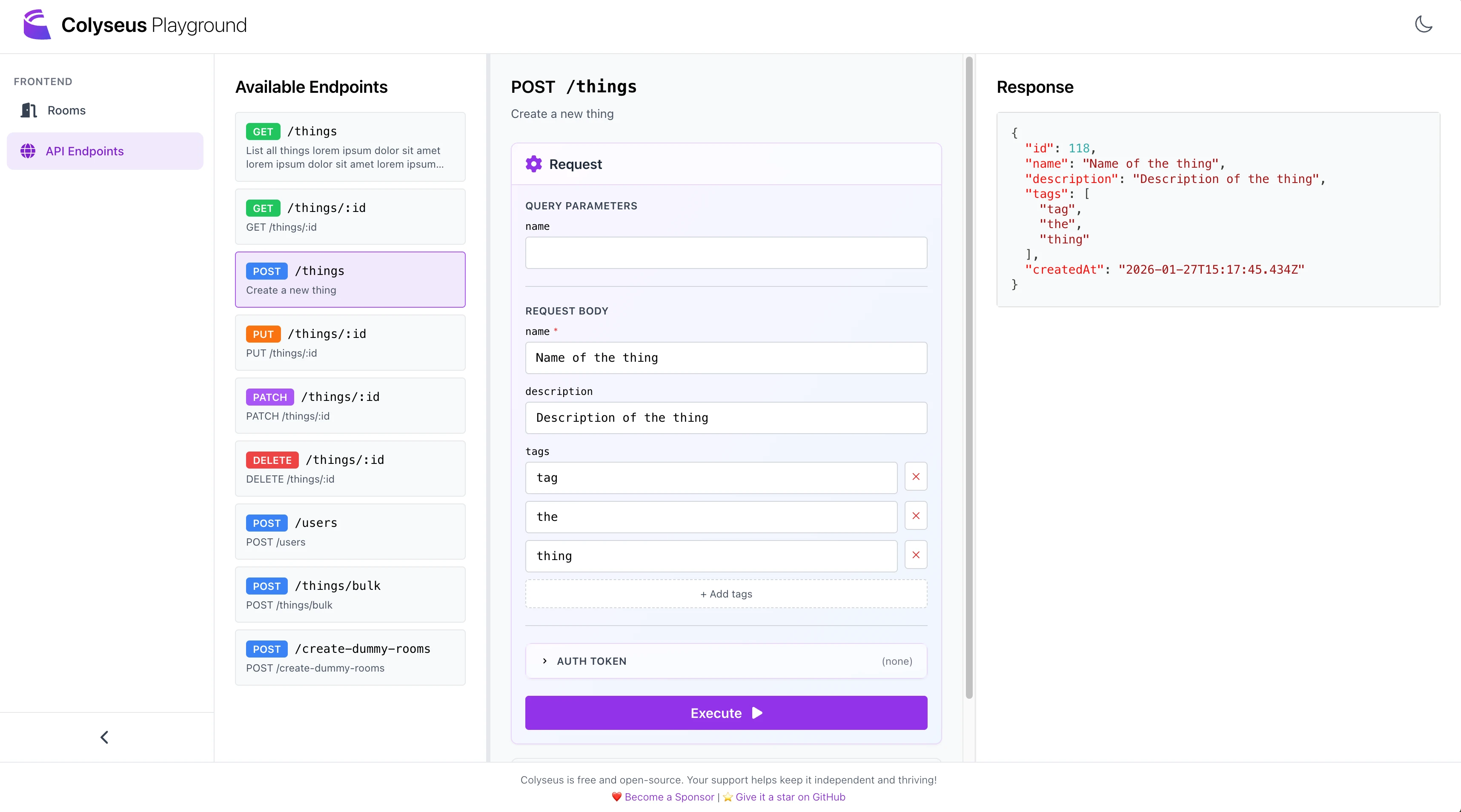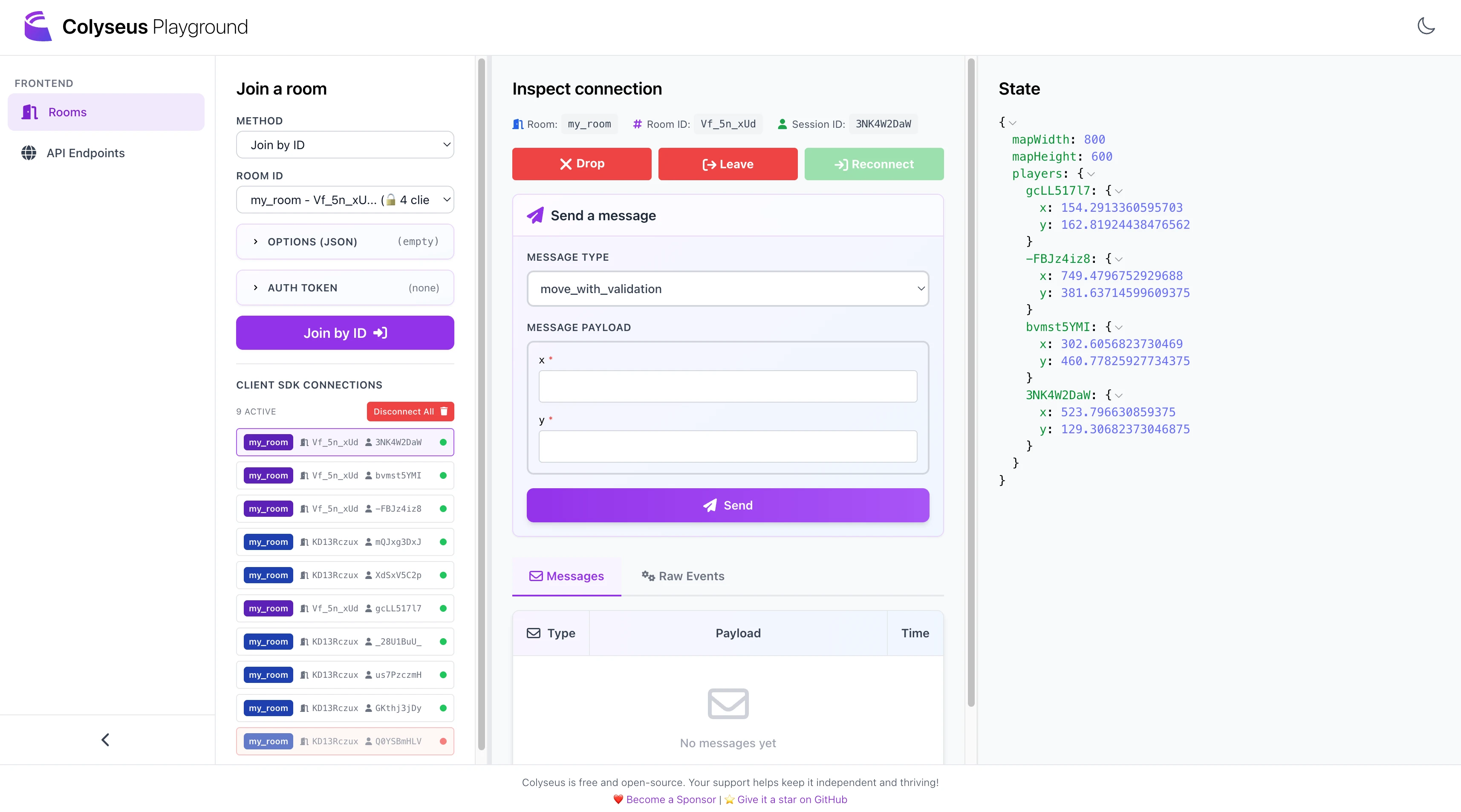 The frontend playground allows to easily create connections with rooms and inspect how they communicate with the server.